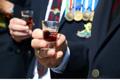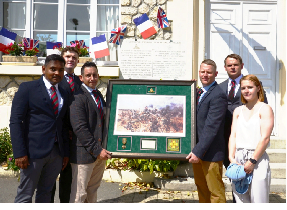 Sunday morning was bright and sunny as it had been one hundred years earlier and at 10:30 hr the ceremony commenced in front of the little Town Hall with its 5th Battery wall plaque and facing the Devons memorial across the road. The Mayor of La Ville-aux-Bois de Pontavert gave a welcome address, followed by an eloquent introduction from Lt. General A J S Storrie CB CBE. The current 5th Battery of six were on the right of the line with our veterans alongside to their left and the Rifles and Devons alongside them. At the far end and across the road were three soldiers in British WW1 uniform and at the top end the dignitaries and the eight of us who were to read the personal accounts of the Battle. Both John and I were enormously honoured to read words spoken respectively by Captain Massey and Gunner Fay (my grandfather), John’s reading being the last before the Lord‘s Prayer, the Last Post and Reveille (by four Rifles’ buglers) and then The Exhortation, Wreath Laying, Nation Anthems and Regimental Marches. The 5thBattery contingent then stayed for a while in front of the town hall plaque for photos and a glass of rum in specially engraved 5 Battery miniature glasses, which were gifted to John and I ... and hopefully to others.