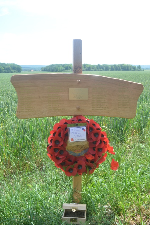 It must have been a touching moment for John to be suddenly introduced to past and present 5th Battery soldiers, all of whom were proud bearers of the Croix de Guerre insignia which was awarded for the gallantry exhibited in the Bois des Buttes battle by his uncle personally on the 27th May 1918 (along with Lt Large) as well as by all his fellow officers, NCOs and men. I’m sure we all felt the poignancy of the moment, sitting as we were in similarly warm relaxing late May sunshine overlooked by fields which had also been fought over as the Aisne battle unfolded.